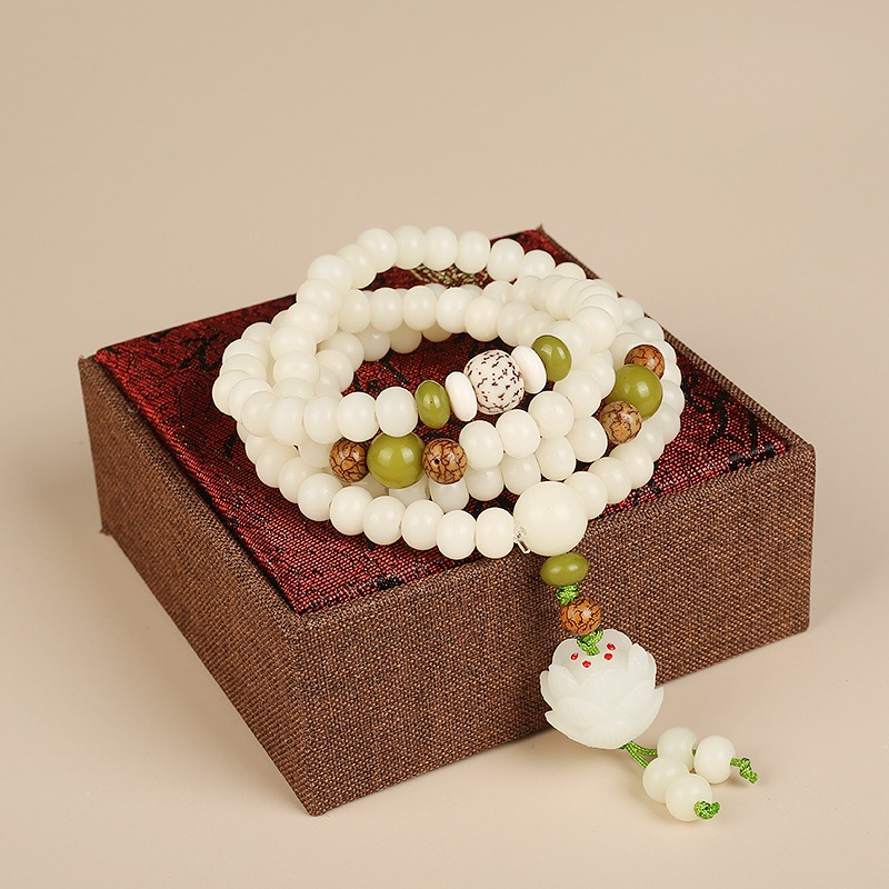 Elevate your spiritual journey with our handcrafted White Jade Bodhi Lotus Mala, a stunning, one-of-a-kind piece made with meticulous artisanal care. Strung on durable elastic cord, this versatile mala works beautifully as a multi-wrap wrist bracelet or a statement spiritual necklace, blending sacred tradition with timeless, serene elegance.